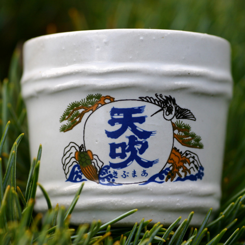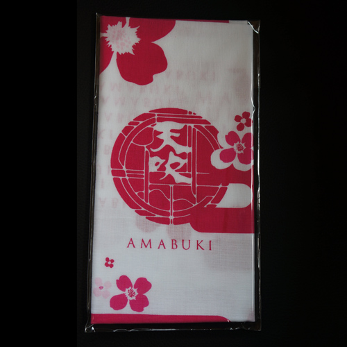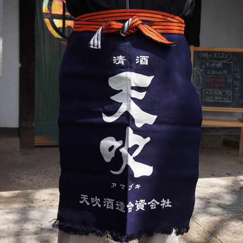 お燗を付ける酒燗樽1,800円(税抜)、大小の天吹ロゴ入り樽型盃 小200円、大500円、有田焼き乾杯こっぷ1,500円(税抜)、前掛け1,500円(税抜)、手ぬぐい500円(税抜)、きき猪口ストラップ1,000円(税抜)など