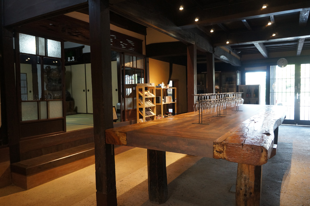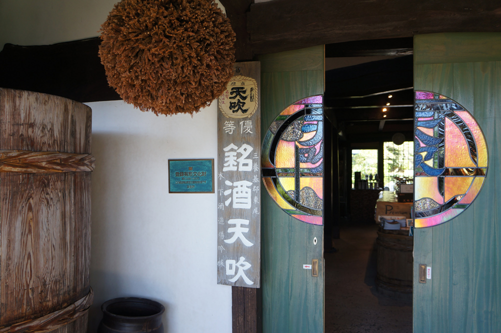 ステンドグラスがはめ込まれた母屋の引き戸を開けるとそこは試飲場、奥に冷蔵庫があります。母屋、酒蔵、煙突など国と県の有形文化財に登録されました