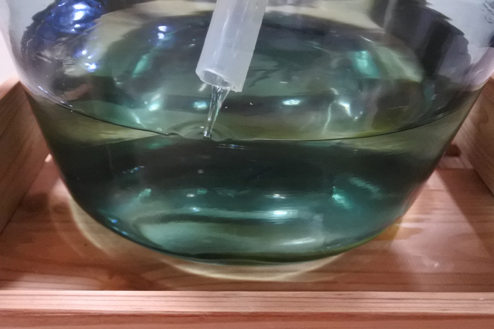 最初の白濁した酒はタンクに戻し濁りの無い酒が出てきたらこれを集めてます。自然の重力で滴り落ちた酒は雑味も少なく美味です。