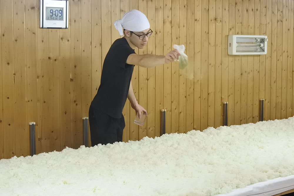 麹室に引き込まれた蒸し米は均一に広げられ種麹菌を散布され一塊にして布で保温、麹菌の成長を待ちます。