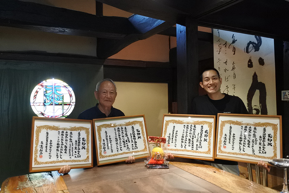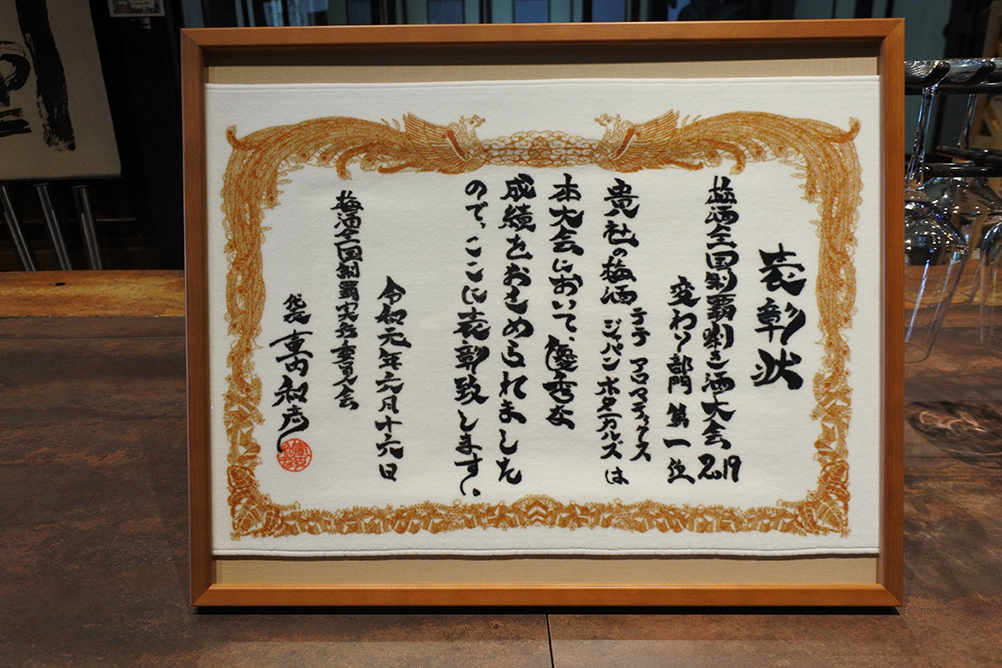 先日大会会長 壷内和彦さまが来社、表彰状をいただきました。トロフィーは手作り、表彰状もタオルで有名な今治なのでタオル生地に会長さまの直筆です。