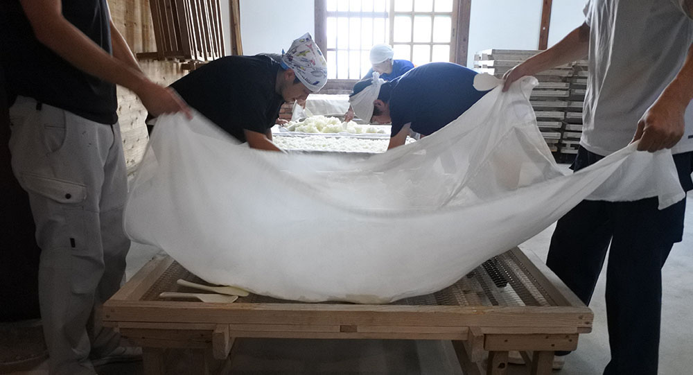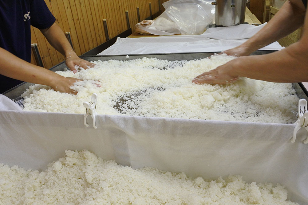 写真中段2枚は引込み後24時間経過しました。「盛」の仕事です。一塊になった蒸米を網目を通して一粒一粒に分離します。