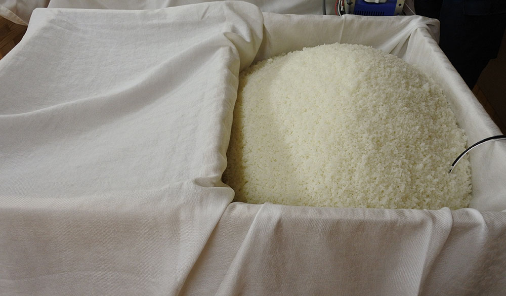 予定温度近くまで冷えたら35℃に保たれた麹室に引込み種麹菌を散布し、2昼夜 温度・湿度管理をして麹を育てます。