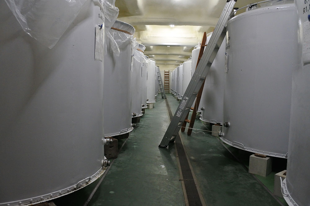 大正時代造られた鉄筋コンクリート製地下貯蔵庫、外壁の一部は土で覆われています。上部には雑草防止のためホワイトクローバーを植えました。現在冷蔵庫仕様に変更、お酒を熟成させるのにタンクで貯蔵、瓶で貯蔵があります。