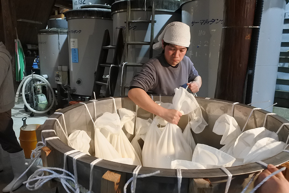 大吟醸の鑑評会出品のため「吊し取り」です。これは酒袋に醪を入れ、タンクに20~30個吊します。自然の自重で酒袋の網目から酒が滲み、やがて滴り落ちてきます。自然の力です。雑味のない、クリアーで繊細な味わいです。