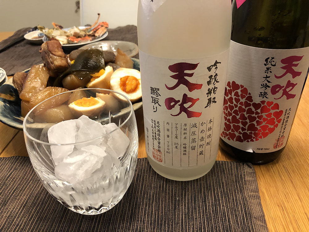 グラスに氷を入れ、粕取り焼酎を注ぐ。そして日本酒をON、焼酎だけでは物足りない味わいが日本酒で付加されるのでは〜。