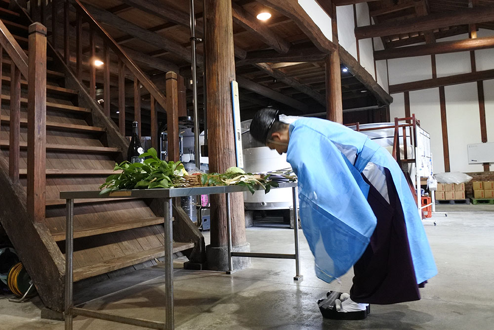 古来より日本酒は神さまにお供えするために造られました。神前にお酒、鯛、野菜、果物などお供えし、旨き酒が出来ますように、社員に病気や怪我がありませんようにと社長を始め社員一同揃って祈念しました。日本酒は神々と人間を結びつける役割を担う神聖なものです。