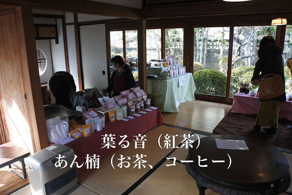 離れ座敷ではあん楠さんのお茶とコービー、テーブルで楽しめました、葉る音さんの紅茶販売。お客さまも作家さんと談笑しながら買い物を楽しんでいらっしゃいました。
