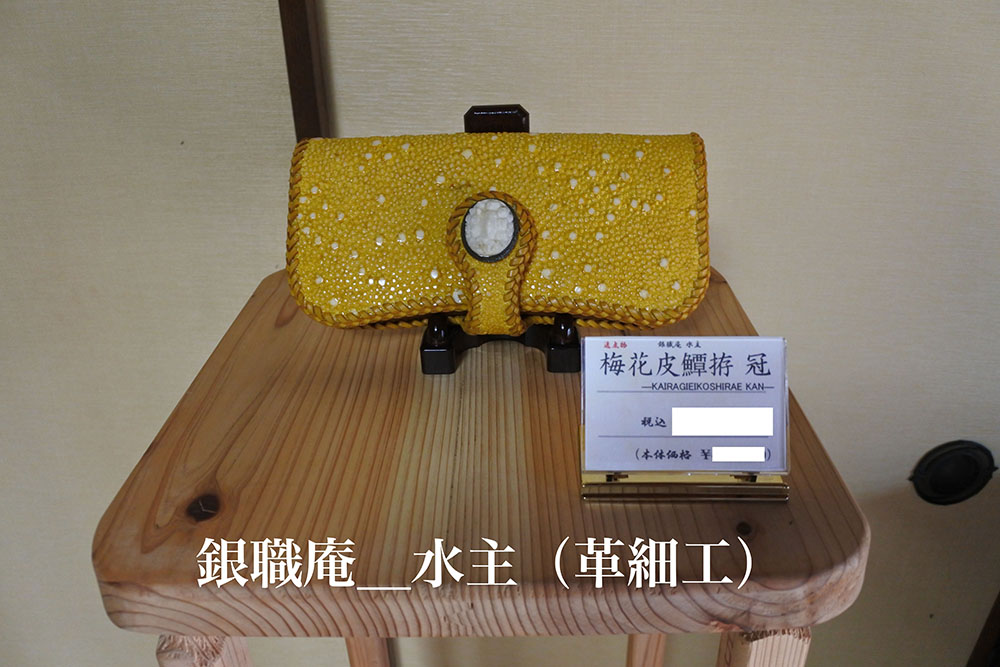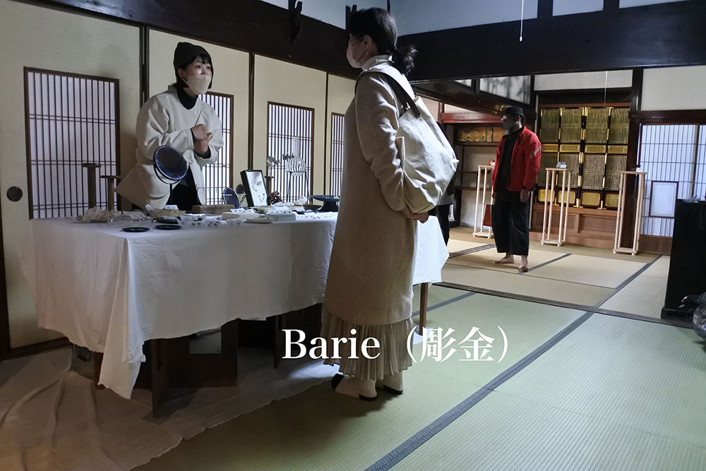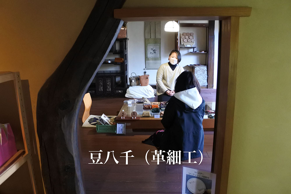 座敷、居間、囲炉裏では銀職庵_水主さの革細工、豆八千さんのお財布、Barieさんの彫金、ISTISTさんの草木染。