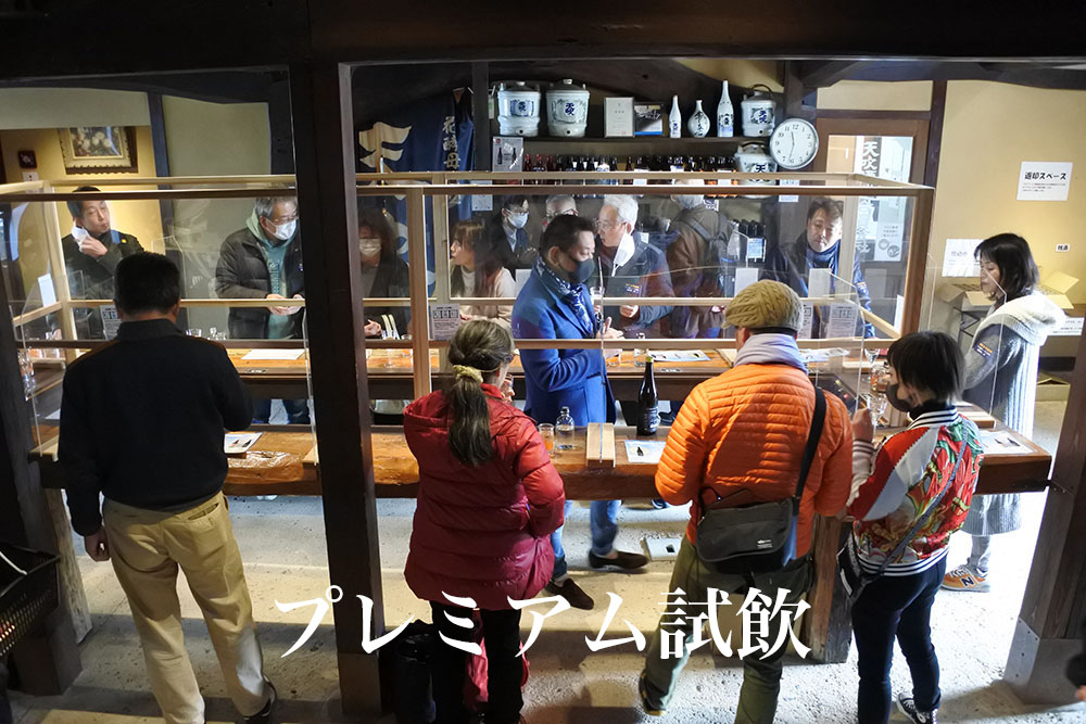 今年製造した大吟醸酒、純米酒などのコーナーあり、お客さまはおちょこを持って巡ります。