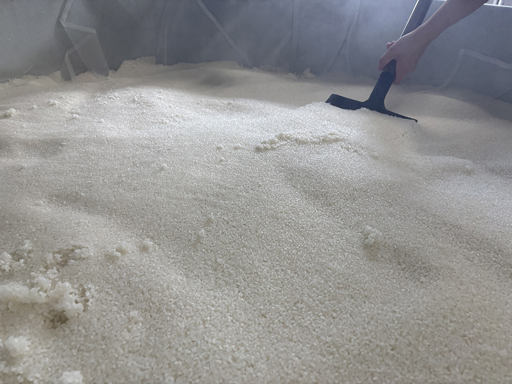 一定時間経過後、酒米を蒸し上がった甑から掘り起こし、放冷機で冷やします。(2枚目)