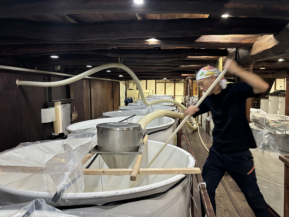 仕込み中は、麹・蒸米・仕込み水、醪が均等に混ざるよう櫂棒で撹拌します 留仕込み後、純米大吟醸は約一ヶ月温度管理と発酵状態を分析をし、搾る前利き酒をし、味のバランスが整ったら搾ります。