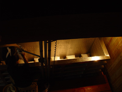 純米吟醸搾りました。槽(ふね)と呼ばれる四角型の槽の中に酒袋(さかぶくろ)に醪を入れ丁寧に重ねます。酒袋の布目の間からお酒が滲み出てきます。これが搾りたての日本酒です。なでしこ酵母で醸したこの酒は香りが高貴で華やかなのが特徴で搾った直後はかすかにガスを含んでいますので軽やかな味わいです。 氷温近くで3〜5日貯蔵し澱(おり)を引きます。このおりを含んでいる「おりがらみ」の味も逸品です。 次は瓶に詰めます。
