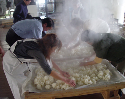 2月7日(土)〜3月7日(日)まで蔵解放します。 お米から日本酒になるまでの過程を体感出来ます。 遊びにきて下さい。 同時開催行事もあります。 詳しくはギャラリーを御覧下さい。 http://www.amabuki.co.jp/gallery/new.html 麹米が蒸し上がりました。 麹を造るため室(むろ)に蒸米を運び込むことを引込みといいます。 引込む前に100℃以上の蒸気で蒸し上がった酒米を甑(蒸し器)から取り出し、一気に45℃程度まで冷やします。 固まりがあると芯の部分は熱いのでほぐすように拡げます。アッチチと言いながら, 思わず口をとがらし息を吹き掛ける仕種が出ます。 素早く仕事をします。冷え過ぎたら麹造りが困難ですから、緊張が走ります。 美味しいお酒は、色々な過程の集大成です。