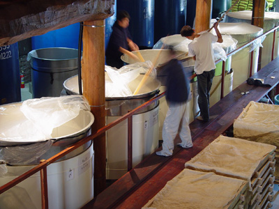 出来上がった麹と仕込み水、酵母菌(酒母)をタンクの中に入れ、それに蒸したお米を冷やして入れます。これを添え仕込みと言います。 添仕込みの翌日は踊りと言い、仕込まずに酵母菌の増殖をはかります。 明日は仲仕込み、明後日は留仕込みです。留仕込み後25日〜30日間低温で発酵させます。 醗酵温度は蔵元や酒質により異なりますが当社では6℃〜10℃〜13℃の範囲で発酵させています。蔵内の温度は6℃前後が理想です。 冬の寒い季節を利用するのはそのためです。気温が低いので雑菌の繁殖も少なく空気もきれいです。高級品造りには環境は大きなの味方の一つです。 3月7日(日)まで蔵解放中です。 お米から日本酒になるまでの過程を体感出来ます。 遊びにきて下さい。お待ちしています。 同時開催行事もあります。 詳しくはギャラリーを御覧下さい。 http://www.amabuki.co.jp/gallery/new.html