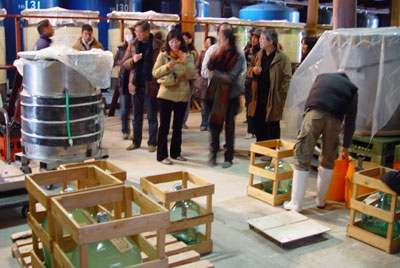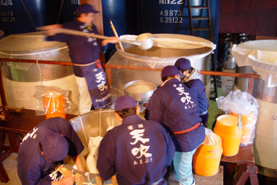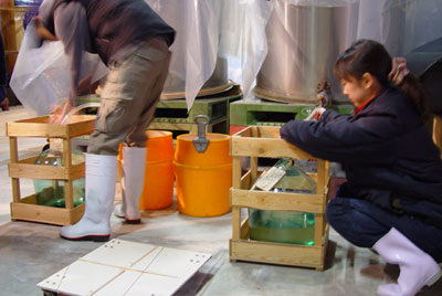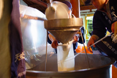 大きなひしゃくでタンクから汲み上げ、大きな漏斗を通じて酒袋に入れます。