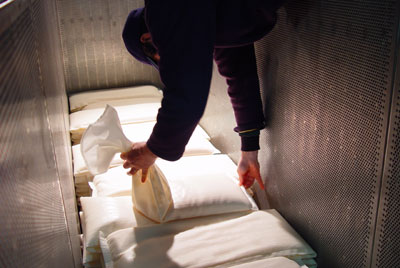 発酵タンクに残った醪は酒袋に入れて搾ります。