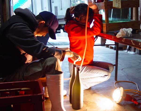 滓引きとは先月斗瓶に入れた大吟醸を冷蔵庫に保管します。 酒の中の浮遊物質が沈降します。出来るだけ低い温度の方が沈降が早いです。 滓が下がり難い場合、味わいもすっきりしない場合が多いです。 先端がU字型したガラス管を滓を吸い込まないように注意して斗瓶に入れます。 吸い口がU字型をしているので酒は上から下に流れが出来ます。 滓は底辺にあり上部は清澄です。下部の滓に影響を与えない先人達の工夫です。一升瓶に詰めます。 最後は慎重に無理をしないように。 数日後、瓶を湯煎をして殺菌します。社内で予選をし、地域の研究会に出品し候補者(酒)を選び、1点選択します。 当社の代表として全国大会に臨みます。 2010年2月大吟醸吊るし取り